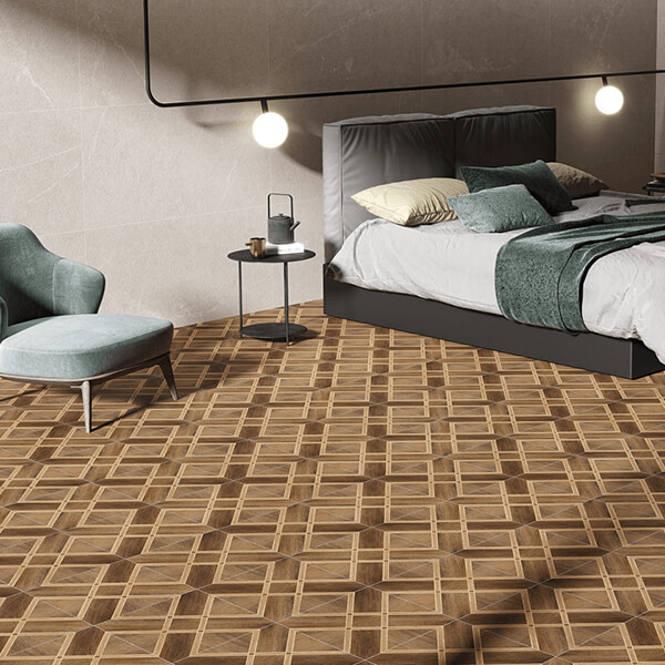 Piso Tipo Cerámico con Formato de 36x36 cm. Diseño Tipo Madera Geométrico, Decorado con TecnologÃa Full Definition y Acabado Semi-Brillante. Aplicación para Interior en Zona Residencial.