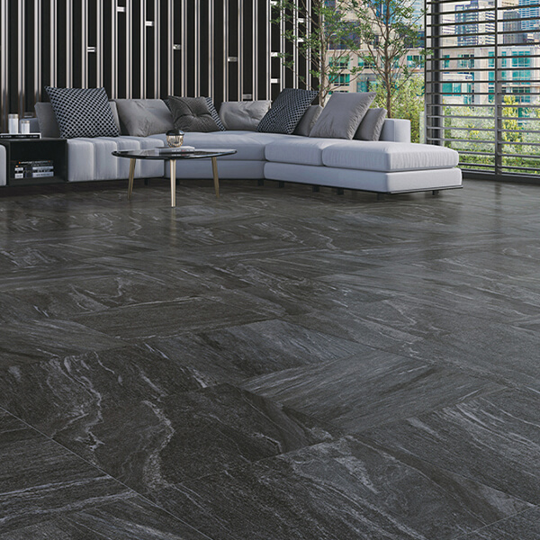 Piso Tipo Dalgres de Modelo ZS38, con Formato de 60.5x60.5 cm. Diseño Tipo Piedra, Decorado con Tecnología Reveal Imaging, y Acabado Mate. Aplicación para Interior en Zona Residencial.